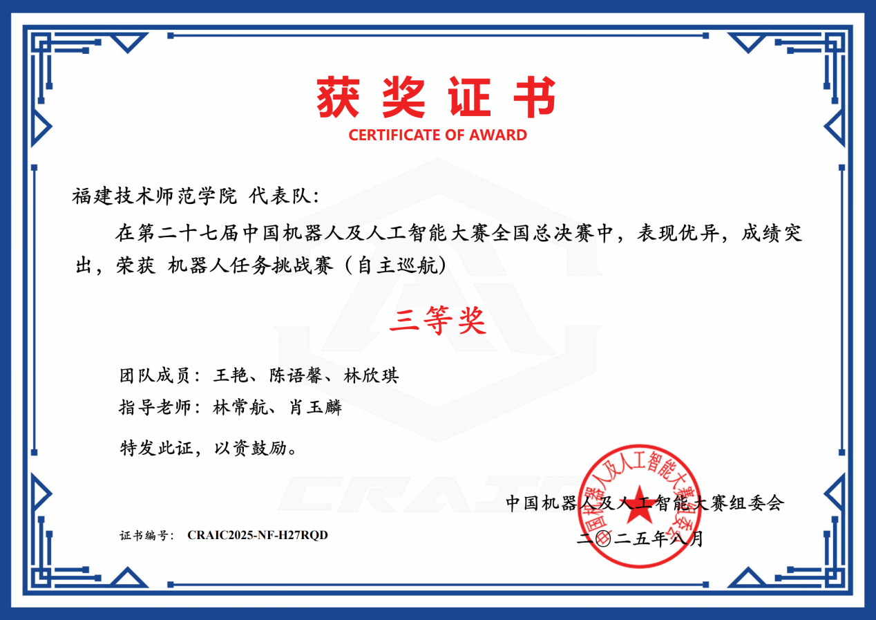近日,在第27届中国机器人及人工智能大赛全国总决赛中,我院学子表现出色,在“机器人任务挑战赛”赛项中荣获全国二等奖1项、全国三等奖2项。其中,2023级人工智能专业王洪超、李继国、王焕垒同学组成的队伍在目标射击赛道获得全国二等奖,指导老师为林常航、陈子健;2024级的林晓晶、林嘉怡、刘锦程同学组成的队伍在目标射击赛道获得全国三等奖,指导老师为林常航;2024级人工智能专业的王艳、陈语馨、林欣琪同学组成的队伍在自主巡航赛道获得全国三等奖,指导老师为林常航、肖玉麟。