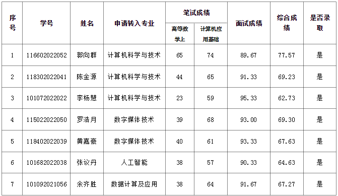 根据教务处关于2023年本科生转专业工作的通知文件,经考核、学院党政联席会议研究决定,我院拟接收转专业学生:计算机科学与技术(师范)专业3人,数字媒体技术专业2人,人工智能专业1人,数据计算及应用专业1人,名单公示如下: