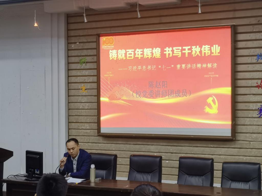 为深入学习贯彻习近平总书记在庆祝中国共产党成立100周年大会上的重要讲话精神,推动党史学习教育进一步走深走实。按照上级部署安排,11月22日晚上,我院邀请校党委讲师团成员陈赵阳副教授做“七一”重要讲话精神解读。我院师生党员和发展对象参与此次讲座。