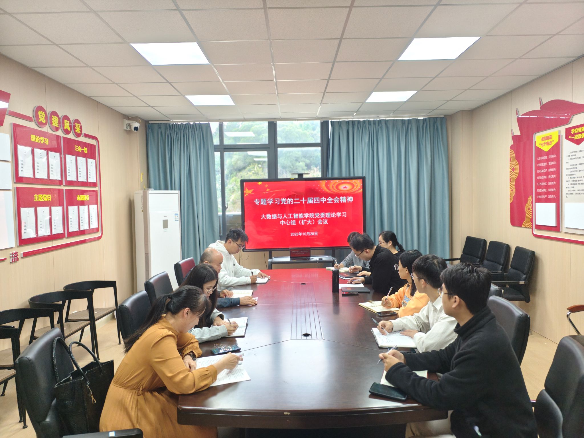 2025年10月28日上午,学院党委理论学习中心组在明德4-503A会议室召开集体学习(扩大)会,专题学习党的二十届四中全会精神。学院全体副科级以上干部、各支部书记、辅导员、组织员等参加会议。会议由院党委书记陈国荣教授主持。