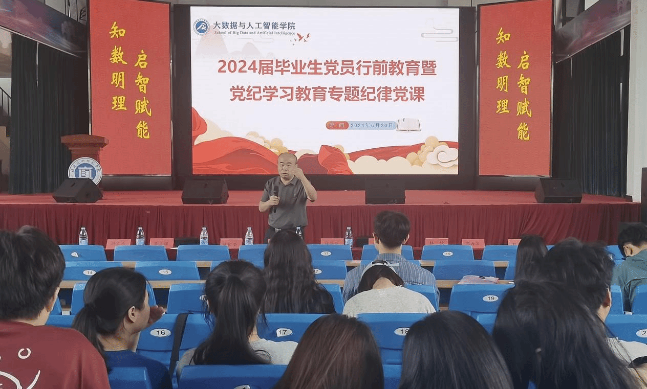 6月20日上午,我院党委在石竹山校区大学生活动中心召开毕业生党员行前教育暨党纪学习教育专题党课。我院党委副书记(主持工作)陈国荣、团委副书记郭海滨以及各年级辅导员、毕业生党员参加了会议。
