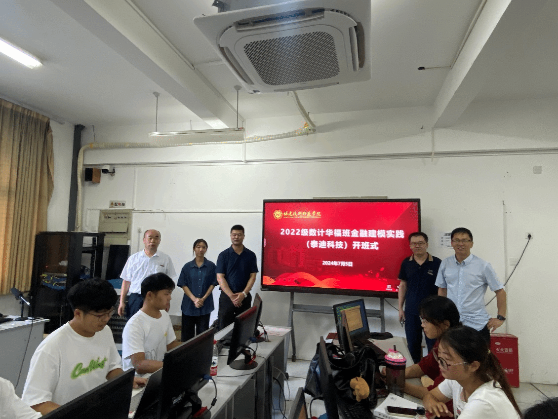 7月5日下午,我院2022级数据计算及应用(华福班)为期五天的金融建模实训在IEC401教室正式开班。院党委副书记(主持工作)陈国荣教授、副院长(主持工作)李立耀教授、副院长游文杰教授、专业主任吴章贵和广州泰迪智能科技有限公司的叶丽凡老师出席了开班仪式。
