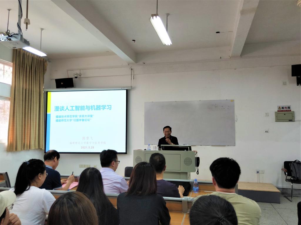 为进一步宣传和丰富人工智能与机器学习的知识,提高我院师生的科学文化素质。5月28日下午,我院于IEC-103为众师生带来一场题为“漫谈人工智能与机器学习”的学术报告,主讲人为福建师范大学陈黎飞教授,报告由我院副院长郭永宁教授主持,我院2018级部分师生近100人聆听了讲座。