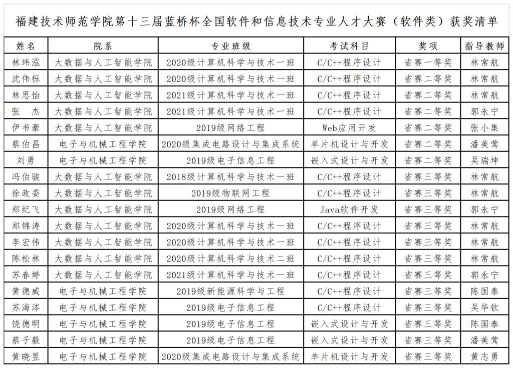 近日,第十三届蓝桥杯全国软件和信息技术专业人才大赛软件类省赛结果揭晓,我院学子脱颖而出,取得优异的成绩,共获得奖项12项,其中一等奖1项,二等奖4项,三等奖7项。2020级计算机科学与技术(师范)专业的林玮泓获得一等奖,将代表学校参加全国总决赛。本次大赛的指导教师是林常航、郭永宁、张小集。
