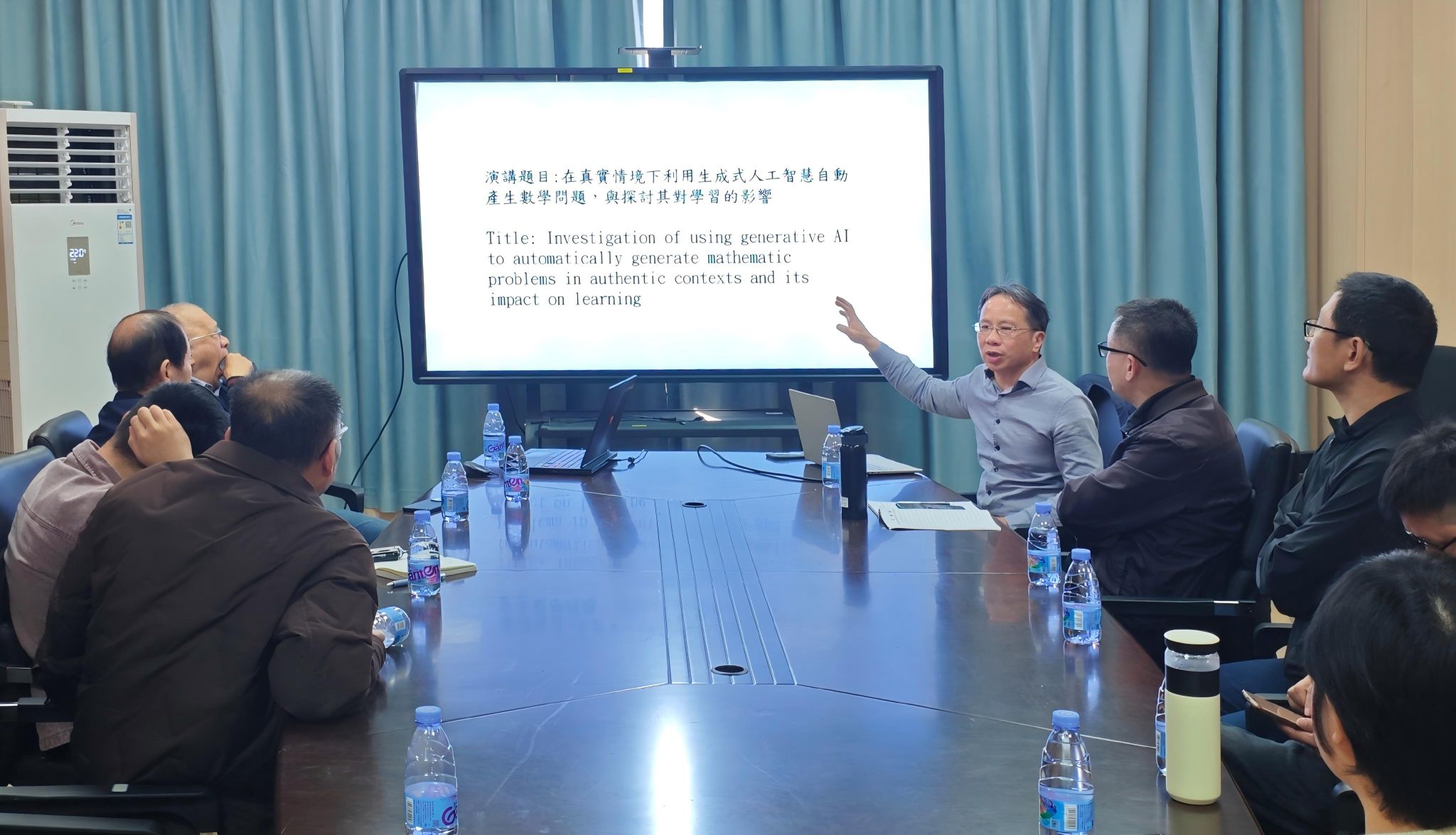 讲座中,黄武元教授围绕生成式人工智能在教育中的应用,介绍其团队在真实情境驱动的数学应用问题自动生成方面的研究进展。报告指出,数学应用问题在促进知识理解与提升问题解决能力方面具有重要作用。针对传统问题设计成本高、个性化不足等问题,提出基于生成式人工智能的自动生成方法,通过情境化、个性化与社会化设计,实现教学目标与问题质量的有效统一。结合自然语言处理与多模态技术,可根据学习者特征动态调节难度,并支持互动与合作学习。其研究表明,该方法有助于提升学习参与度与高阶认知能力。交流环节中,与会教师围绕课堂应用、教学评价及跨学科融合等问题进行讨论,黄教授作了回应并分享自己实践经验。