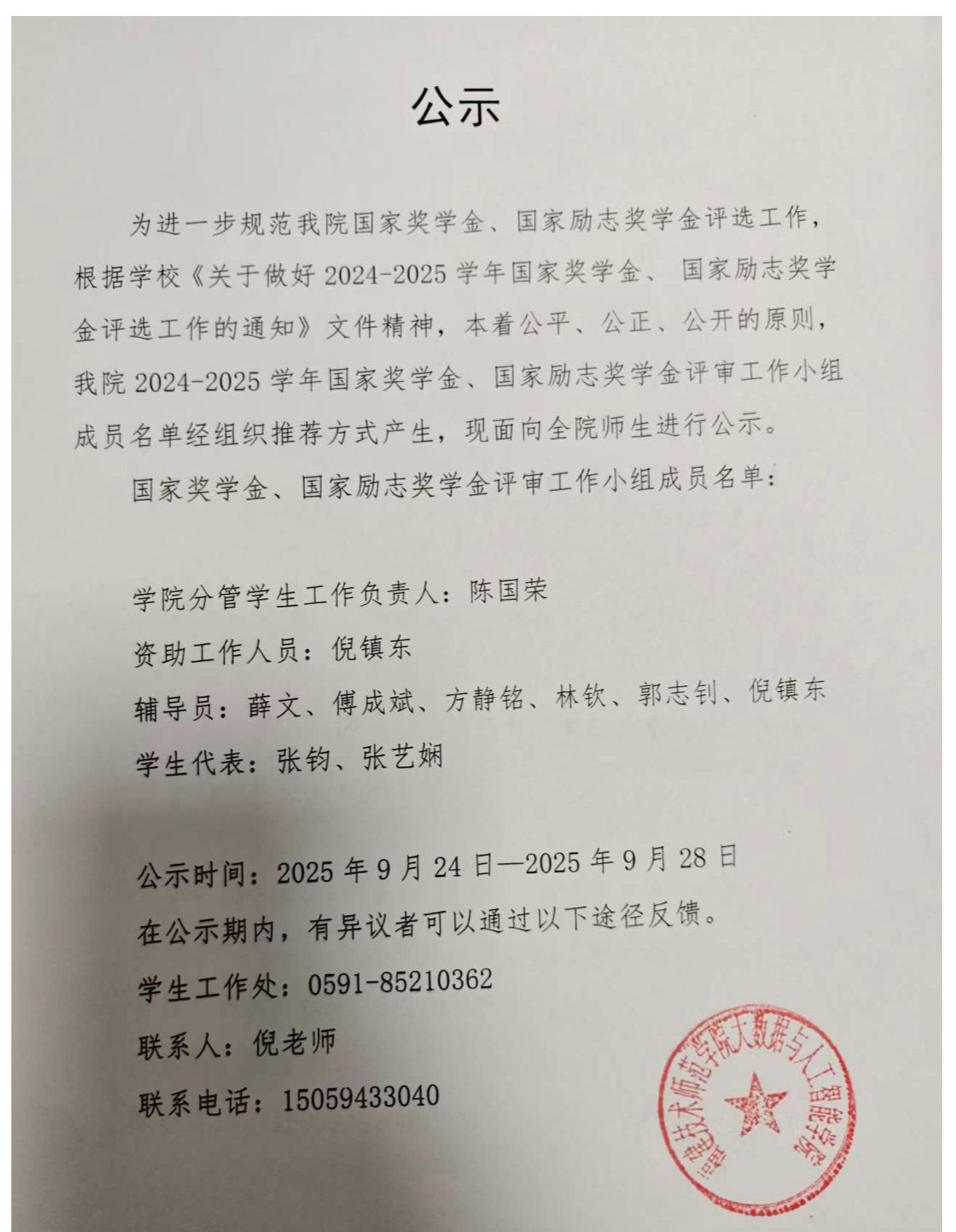 学院2024-2025学年国家奖学金、国家励志奖学金评审工作小组成员名单