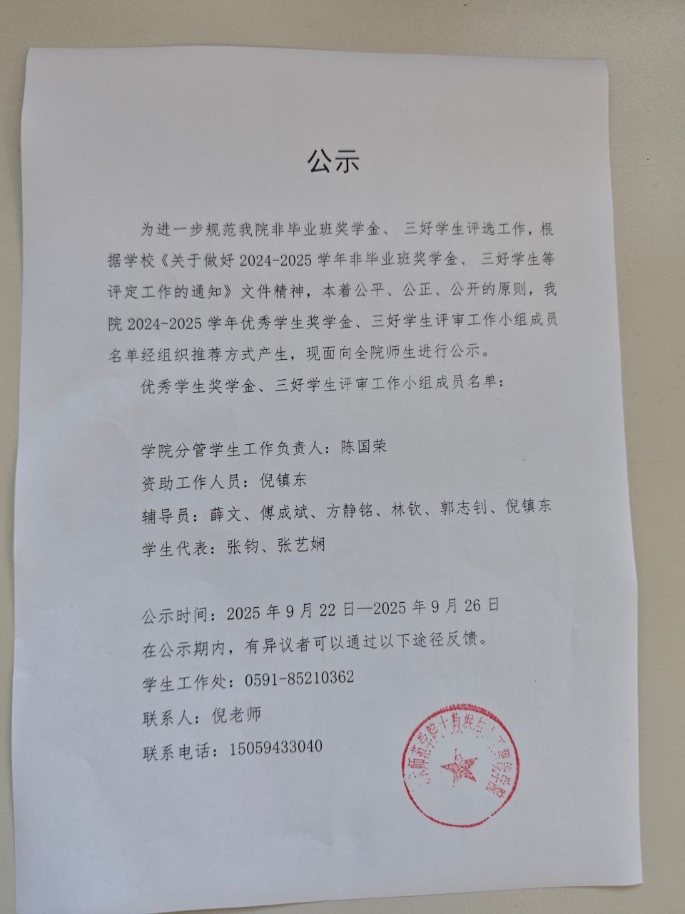 学院2024-2025学年非毕业班优秀学生奖学金、三好学生评审工作小组成员名单公示