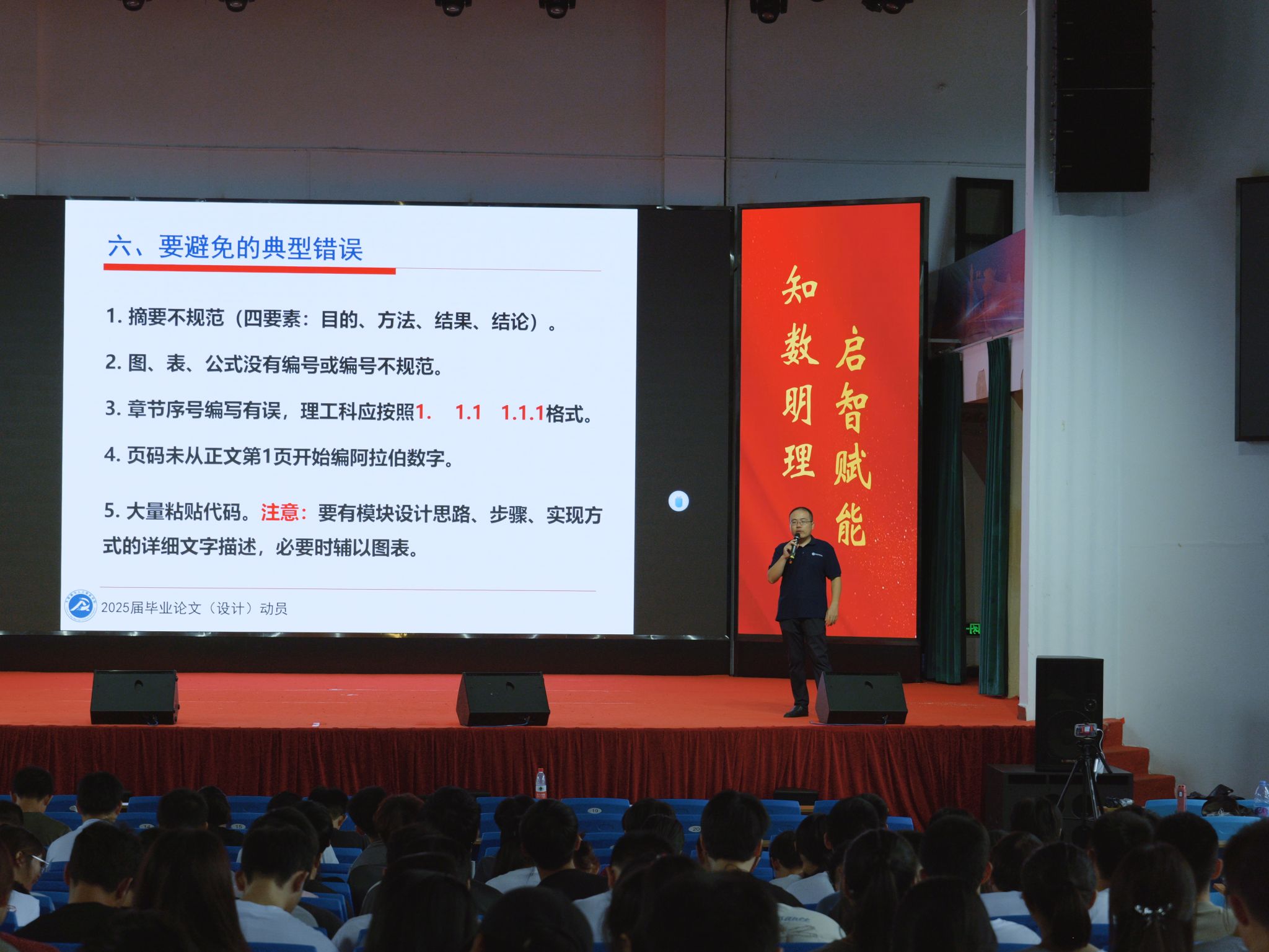为切实做好2025届本科毕业论文及毕业实习工作,促进学生高质量完成学业和实现就业,9月26日,我院于石竹校区学生活动中心召开2025届毕业论文(设计)暨实习就业动员大会,会议由学院副院长赵少卡副教授主持,全体在校2025届毕业生参加,部分校外实习学生通过线上直播方式参加。