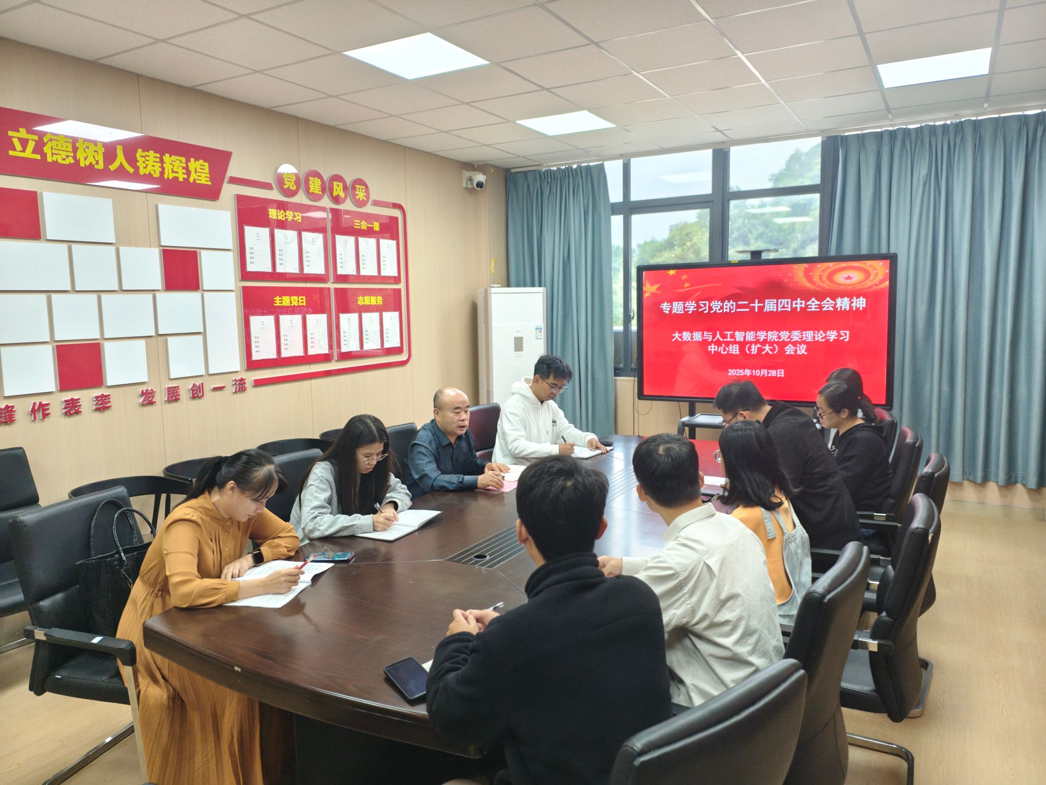 2025年10月28日上午,学院党委理论学习中心组在明德4-503A会议室召开集体学习(扩大)会,专题学习党的二十届四中全会精神。学院全体副科级以上干部、各支部书记、辅导员、组织员等参加会议。会议由院党委书记陈国荣教授主持。