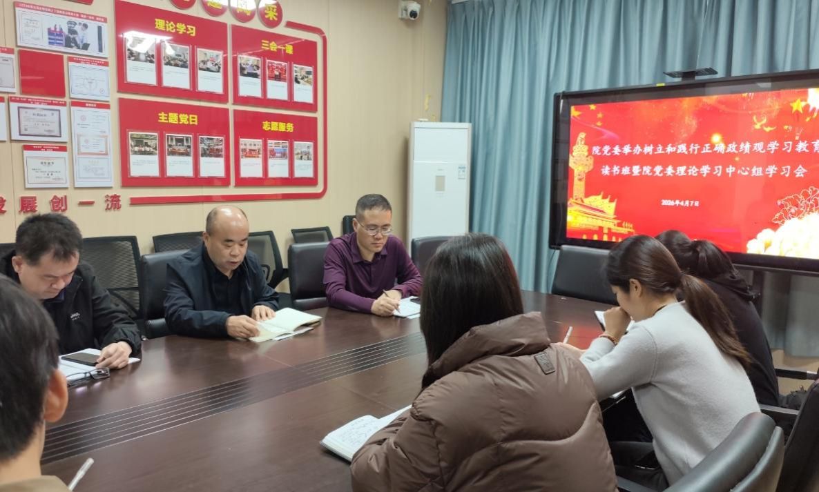 2026年4月7日下午,我院党委在明德4-503会议室举办树立和践行正确政绩观学习教育读书班暨院党委理论学习中心组学习会。会议由院党委书记陈国荣教授主持,会上集体学习了《习近平关于树立和践行正确政绩观论述摘编》并观看了警示教育片,副院长游文杰作交流发言并开展学习研讨。