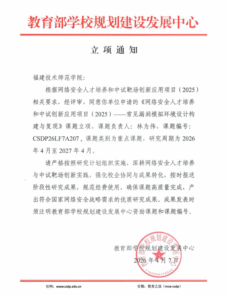 近日,我院成功获批教育部学校规划建设发展中心“网络安全人才培养和中试靶场创新应用项目”重点课题立项。课题名称:“网络安全人才培养和中试创新应用项目(2025)——常见漏洞模拟环境设计构建与复现”,课题负责人:林为伟,课题核心成员:李立耀、詹永华、苏国栋、陈泗盛,课题编号:CSDP26LF7A207。